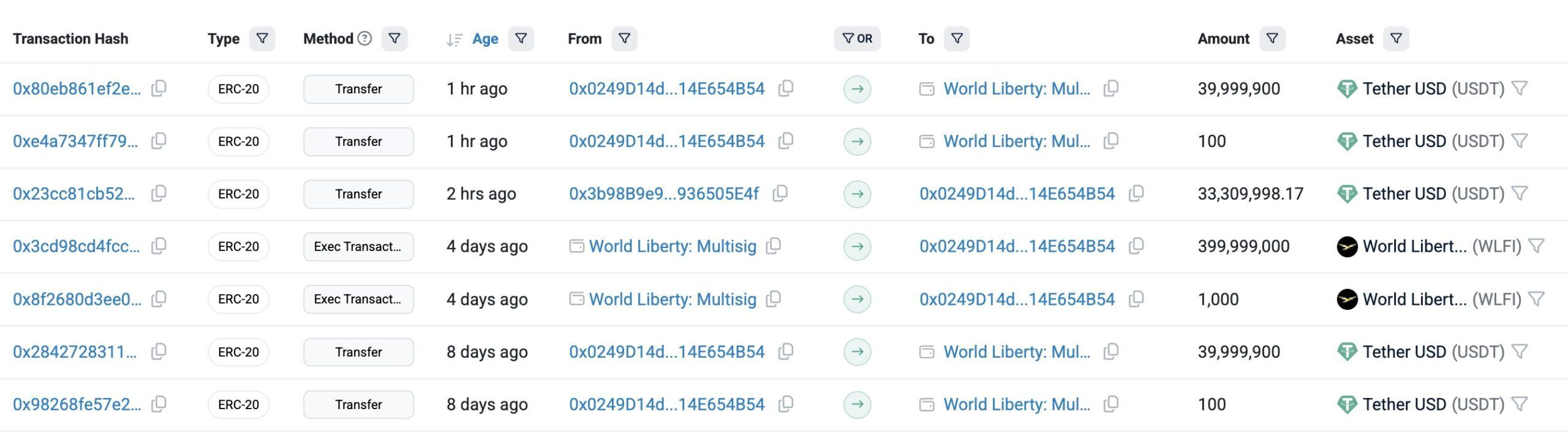 Enligt Lookonchain-data har en val identifierad som 0x0249 spenderat totalt 80 miljoner Tether (USDT) för att köpa 800 miljoner WLFI-tokens. Transaktioner som lyfts fram i ett inlägg på X av blockchain-analysplattformen tyder på att dessa var över disk (OTC) affärer.