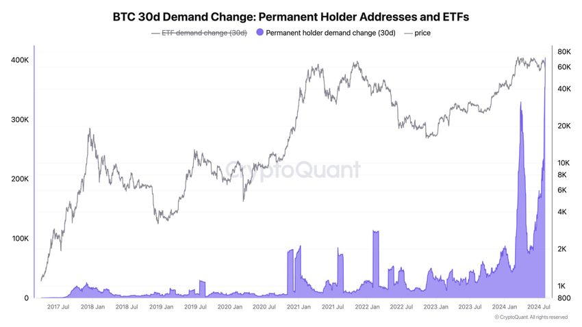On-chain-data från CryptoQuant visar att över 404 000 Bitcoins har flyttat till permanenta innehavaradresser under de senaste 30 dagarna. Ki Young Ju, VD för CryptoQuant, uppgav att detta är “helt klart ackumulering”. Ki noterade också betydande inflöden av 40 000 Bitcoin till amerikanska spotbörshandlade fonder (ETF:er) under de senaste 30 dagarna.
