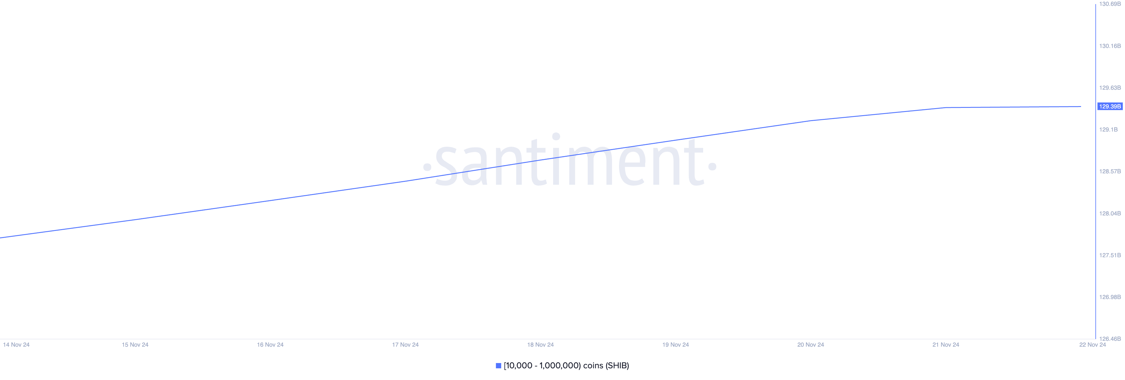 Shiba Inu-valar visade sig också denna vecka. Enligt Santiment var saldot på adresser som håller mellan 10 000 och 1 000 000 SHIB den 14 november 127 miljarder SHIB.