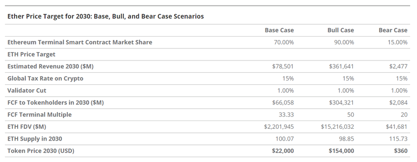 “Den centrala tillgången i detta finansiella system är ETH-token, och i vårt uppdaterade basfall tror vi att det är värt $ 22,000 år 2030, vilket motsvarar en totalavkastning på 487% från dagens ETH-pris, en sammansatt årlig tillväxttakt (CAGR) på 37.8%”, uppgav företaget.