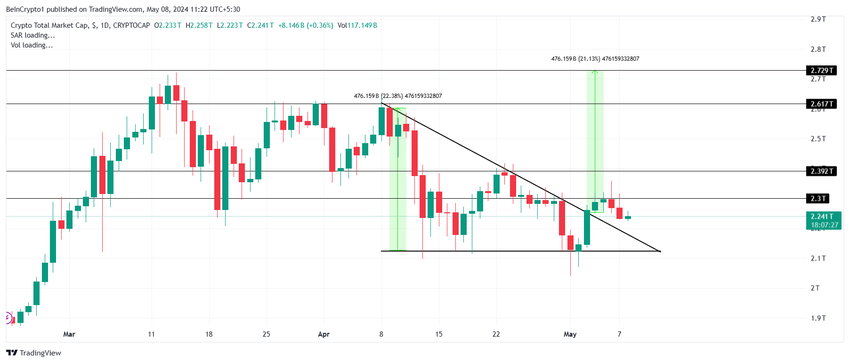 På 2,24 biljoner dollar kan det totala kryptomarknadsvärdet notera en mindre nedgång till 2,20 biljoner dollar eller lägre för att testa den fallande trendlinjen som stöd.