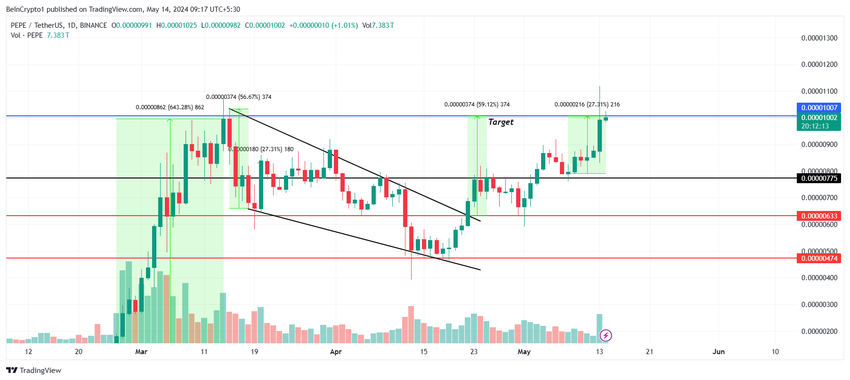 Detta markerar andra gången PEPE-priset har nått en ATH i år, med den föregående som registrerades i mitten av mars.
