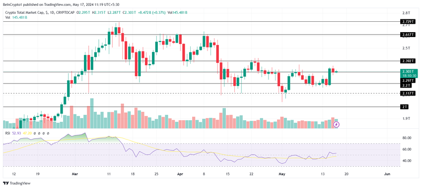 Efter den senaste tidens rally svalnar det totala marknadsvärdet men håller sig över det återvunna stödet på 2,3 biljoner dollar. Målet för kryptomarknaden ligger dock kvar på 2,4 biljoner dollar, en barriär som inte har brutits på nästan en månad.