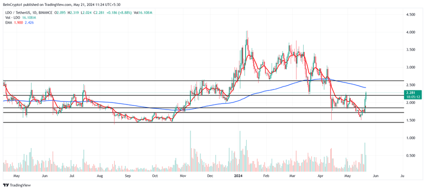 Tillsammans med Bitcoin och andra toppkryptotillgångar ökade Lido DAO: s pris och framträdde som den bäst presterande tillgången för dagen. Inom 24 timmar fick LDO nästan 30%, vilket gav handelspriset till $ 2.28 från $ 1.7.