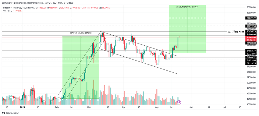 Kryptotillgången har följt det målmönster som fastställts av flaggmönstret under de senaste tre och en halv månaderna. Om BTC lyckas vända motståndet på 71,800 XNUMX dollar till stöd kan det skapa en ny heltidshöjd före slutet av veckan.