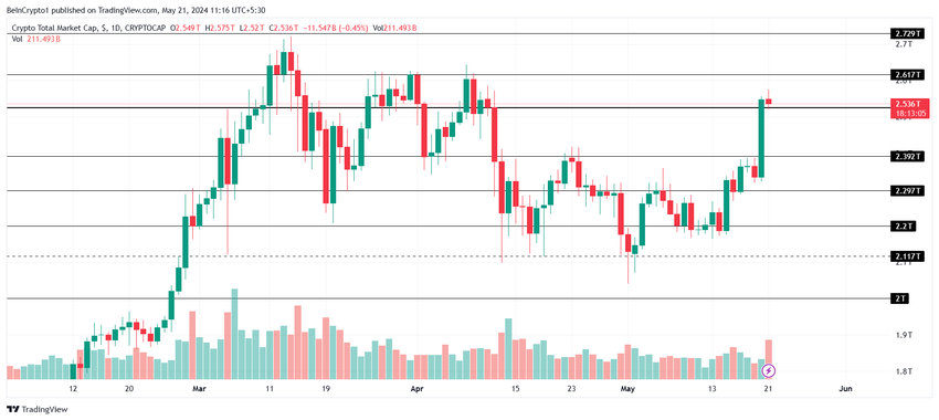 Det totala marknadsvärdet passerade 2.50 biljoner dollar igår efter hausse från investerare. Ökningen drevs av ökningen av spot Bitcoin ETF-inflöden under den senaste veckan och det potentiella godkännandet av spot Ethereum ETF: er.