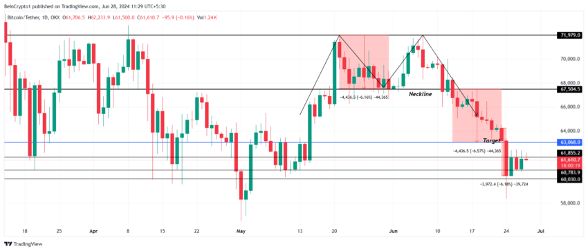 Bitcoins pris på 61 610 dollar är nära att återta stödet vid 61 855 dollar. Att vända denna nivå till stöd är avgörande om BTC har för avsikt att pressa uppåt och bryta motståndet på $63 068.