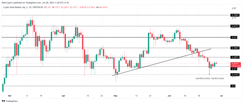 Den totala kryptomarknaden återhämtar sig från den senaste nedgången och ligger för närvarande på 2,23 biljoner dollar. TOTAL har stigit från stödet på 2,20 biljoner dollar under de senaste dagarna och noterar en långsam återhämtning.