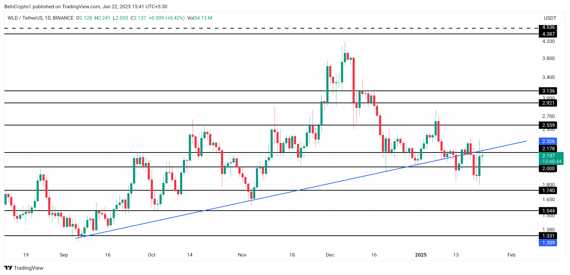 WLD:s pris steg med 12 % de senaste 24 timmarna, drivet av det positiva sentimentet kring detta partnerskap. Denna uppgång kan göra det möjligt för altcoin att återta sin fyra månader gamla uppåtgående trendlinje som stöd. Om det lyckas kan WLD sikta på 2,55 USD de kommande dagarna, vilket förstärker dess positiva momentum.