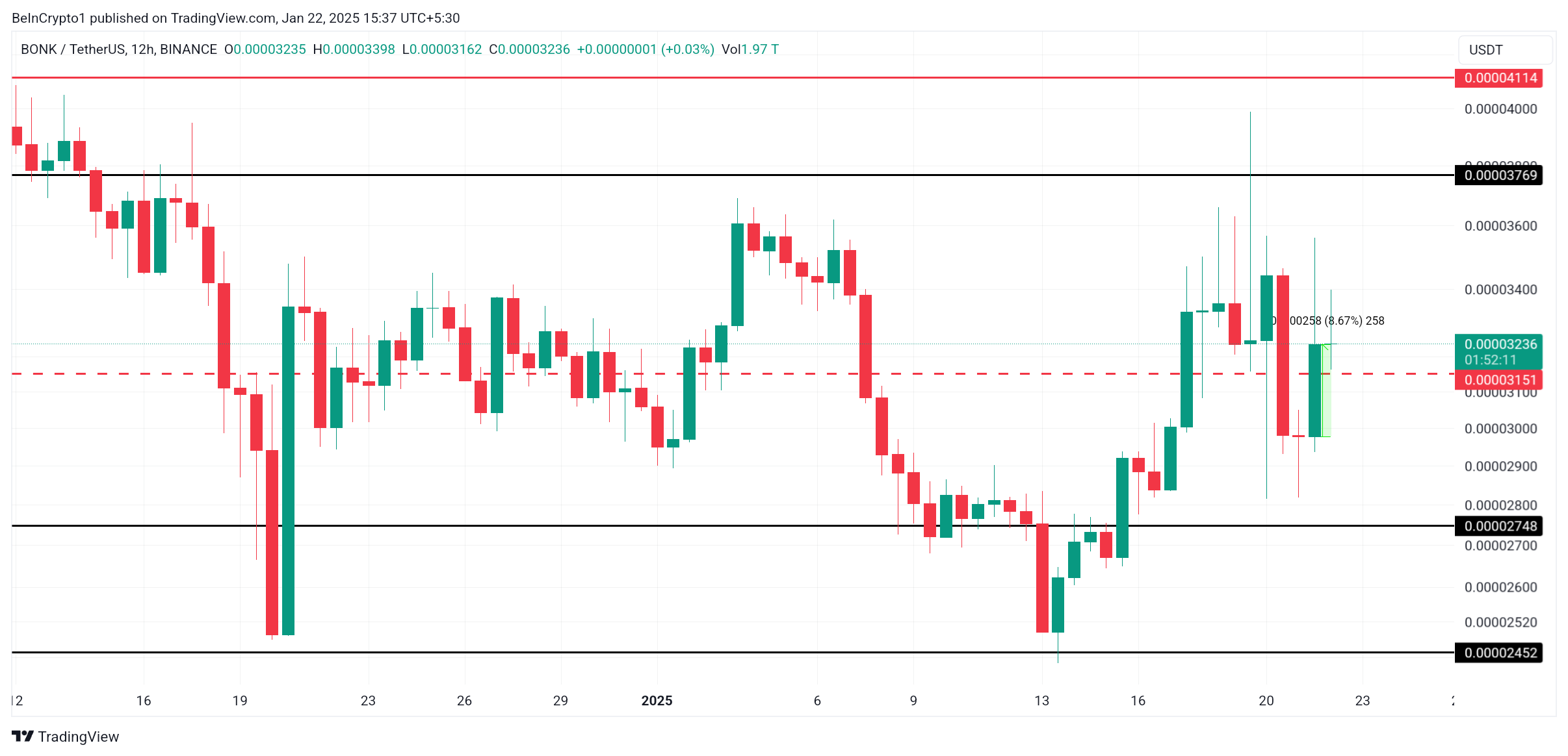 Token noterade en ökning på 8 %, handlas för 0,00003236 USD och siktar på 0,00003151 USD som en kritisk stödnivå. Att säkra denna nivå skulle stärka meme-myntets återhämtningsutsikter och potentiellt locka mer positivt momentum.