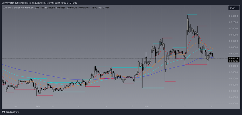 Ett vaksamt öga måste kastas på XRP:s 4-timmars prisdiagram, som för närvarande antyder ett potentiellt golv på cirka 0,58 USD. Om detta kritiska stöd smulas sönder kan XRP bevittna en djupare korrigering och sjunka till 0,51 USD, en minskning med 15%.