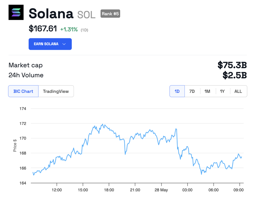 Trots betydelsen av denna policyförändring har den knappt påverkat Solanas marknadspris. Kryptovalutan handlas för närvarande till $167,61, en ökning med 1,31% under de senaste 24 timmarna.