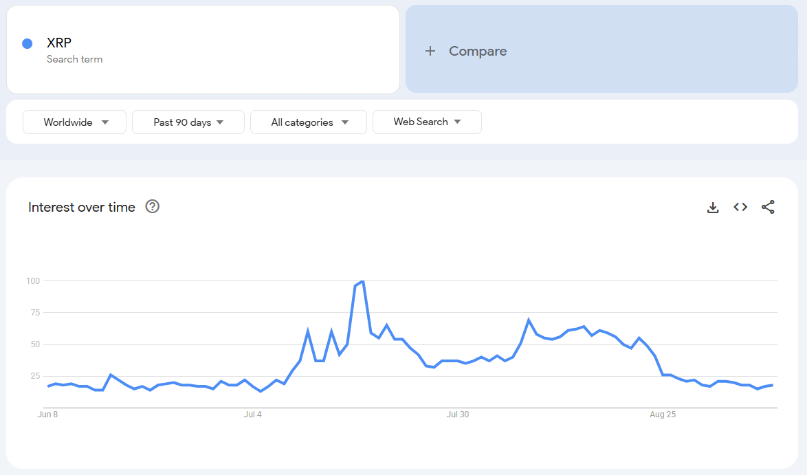 Google Trends speglar globala sökningar efter sökordet “XRP,” vilket ofta är en ledande indikator på detaljhandelns och mediernas uppmärksamhet.