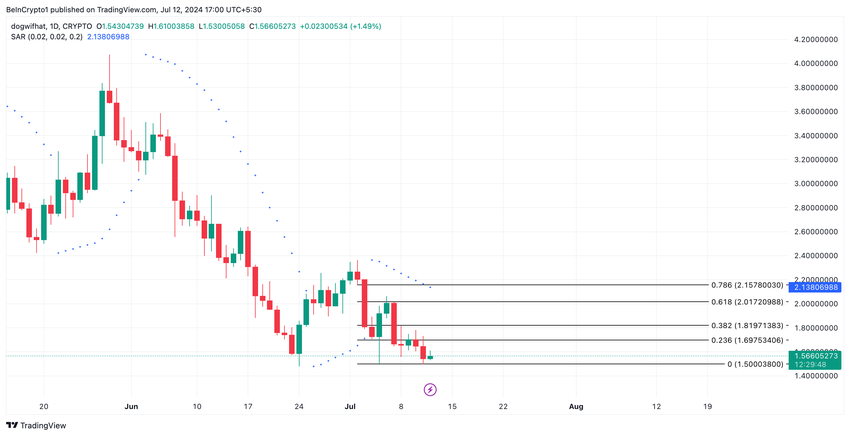 Avläsningar från WIF:s Parabolic Stop and Reverse (SAR)-indikator tyder på att prisnedgången kan sträcka sig in i helgen. Detta indikerar att de baisseartade känslorna som följer meme-myntet fortfarande är betydande.