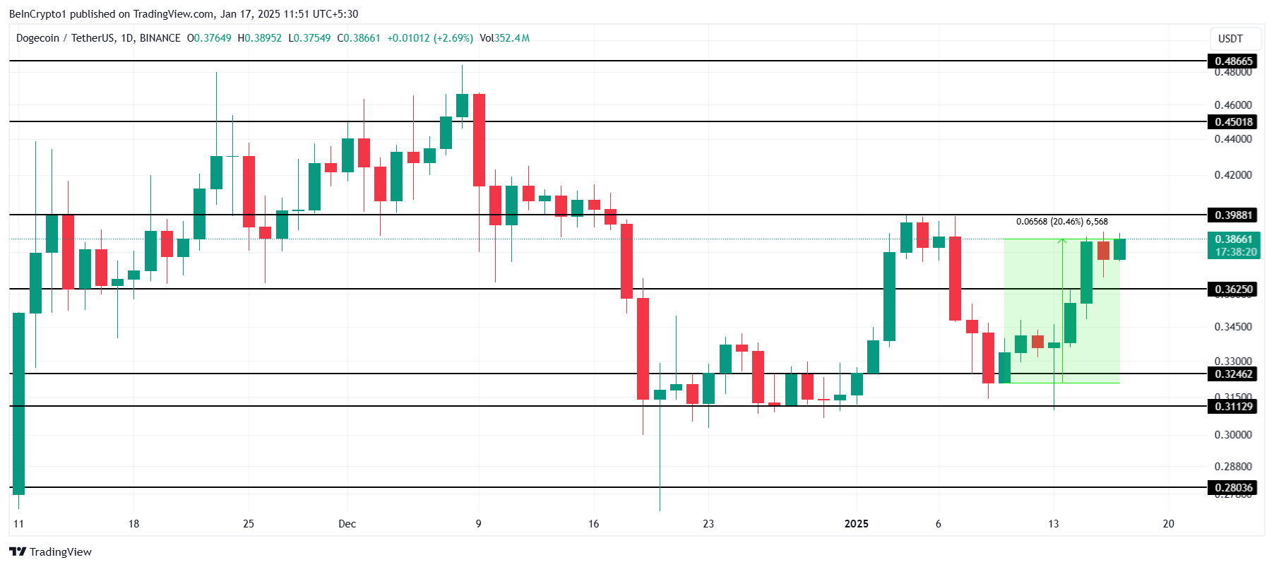 Å andra sidan, om det misslyckas med att bryta 0,39 USD kan det leda till förlängd konsolidering över 0,36 USD. Ett fall under 0,36 USD skulle ogiltigförklara den positiva utsikten och potentiellt signalera ytterligare nedgång för Dogecoin.