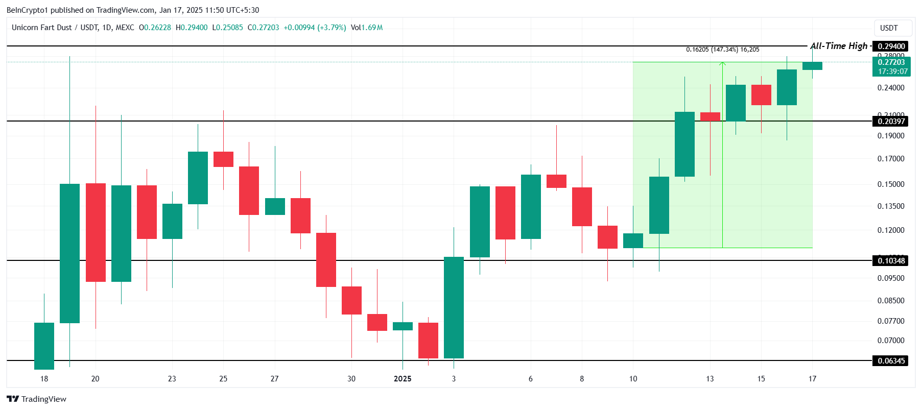 Uppgången drev UFD till en ny rekordnivå på 0,29 USD. Om upptrenden fortsätter kan meme-myntet bryta 0,30 USD, vilket ytterligare stärker dess position som en framstående aktör på kryptomarknaden.