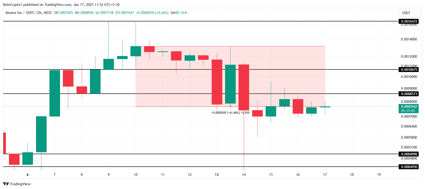 Om nedgången fortsätter kan AKUMA sjunka ytterligare till 0,0004 USD, vilket fördjupar förlusterna för innehavare. Detta scenario kan befästa dess position som månadens sämst presterande meme-mynt, vilket orsakar ytterligare marknadstvekan.