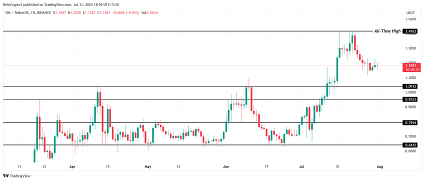 Sedan dess har kryptotillgången minskat avsevärt och raderat en tredjedel av de vinster som noterats nyligen. Nedgången har resulterat i att OM har förlorat stödet på $1,20. RWA-tillgången håller sig dock fortfarande över stödet på $1,04.