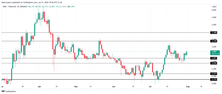 Detta inkluderar också att skala upp DAI-utbudet till 100 miljarder. MKR kommer att lanseras sommaren 2024 och kan dra nytta av denna hype för att bryta motståndet vid $3 159 och säkra $3 000 som ett stödgolv. Detta skulle möjliggöra ytterligare tillväxt och matcha entusiasmen hos MKR-investerare.