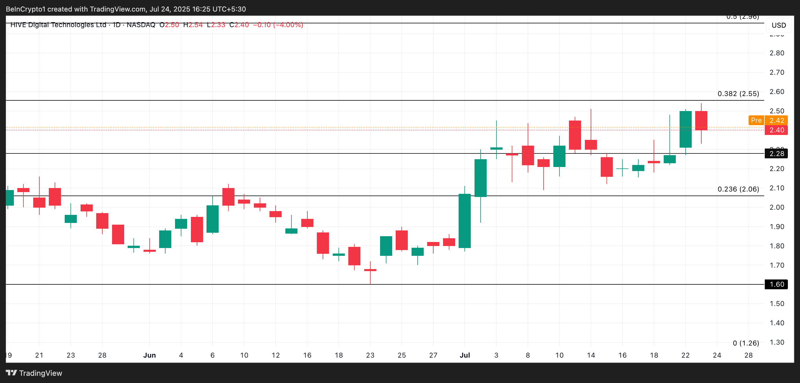 På onsdagen stängde HIVE:s aktier på 2,40 USD, en nedgång med 4 %. Trots nedgången visar HIVE tecken på styrka i dagens förmarknadssession, handlas på 2,42 USD. Denna uppgång kommer efter att företaget meddelade en stor milstolpe — att ha passerat 13 Exahash per sekund (EH/s) i den globala Bitcoin-gruvhashraten.