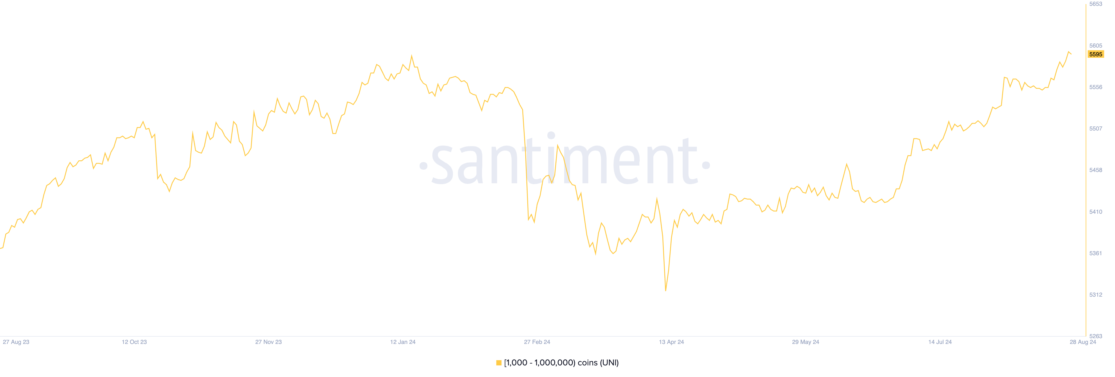 Data från Santiment visar att antalet UNI-valar som håller mellan 1 000 och 1 000 000 UNI-tokens har ökat med 1% under den senaste månaden. För närvarande består denna grupp av 5 595 adresser, vilket är det högsta antalet sedan den 10 januari.