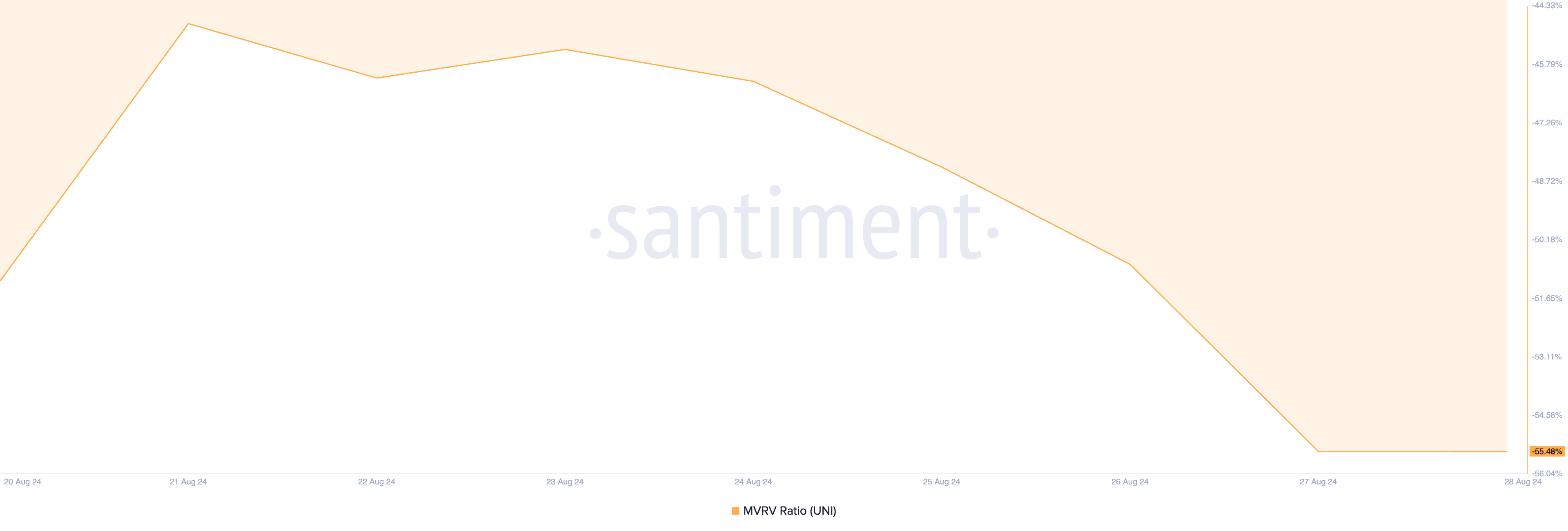 Under den senaste månaden har värdet på Uniswaps inhemska token sjunkit med 27%, med altcoinen som för närvarande handlas till 5,71 USD. Trots detta fall presenterar nedgången en potentiell köpmöjlighet, som indikeras av dess negativa marknadsvärde till realiserat värde (MVRV) förhållande.