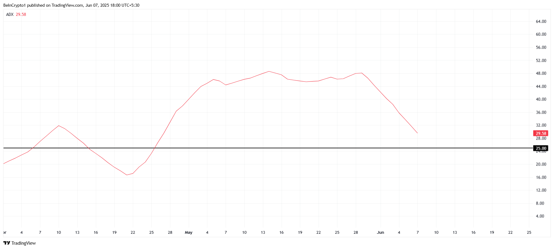 ADX ligger fortfarande över tröskeln på 25,0, vilket signalerar viss styrka i den nuvarande trenden.