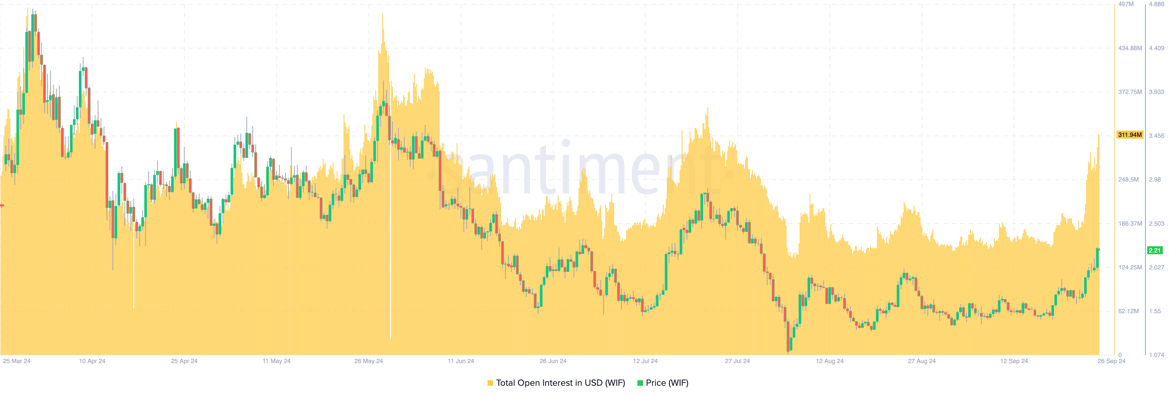 En indikator som antyder en potentiell prisökning för WIF är det öppna intresset (OI), som mäter det totala värdet av öppna kontrakt relaterade till kryptovalutan.