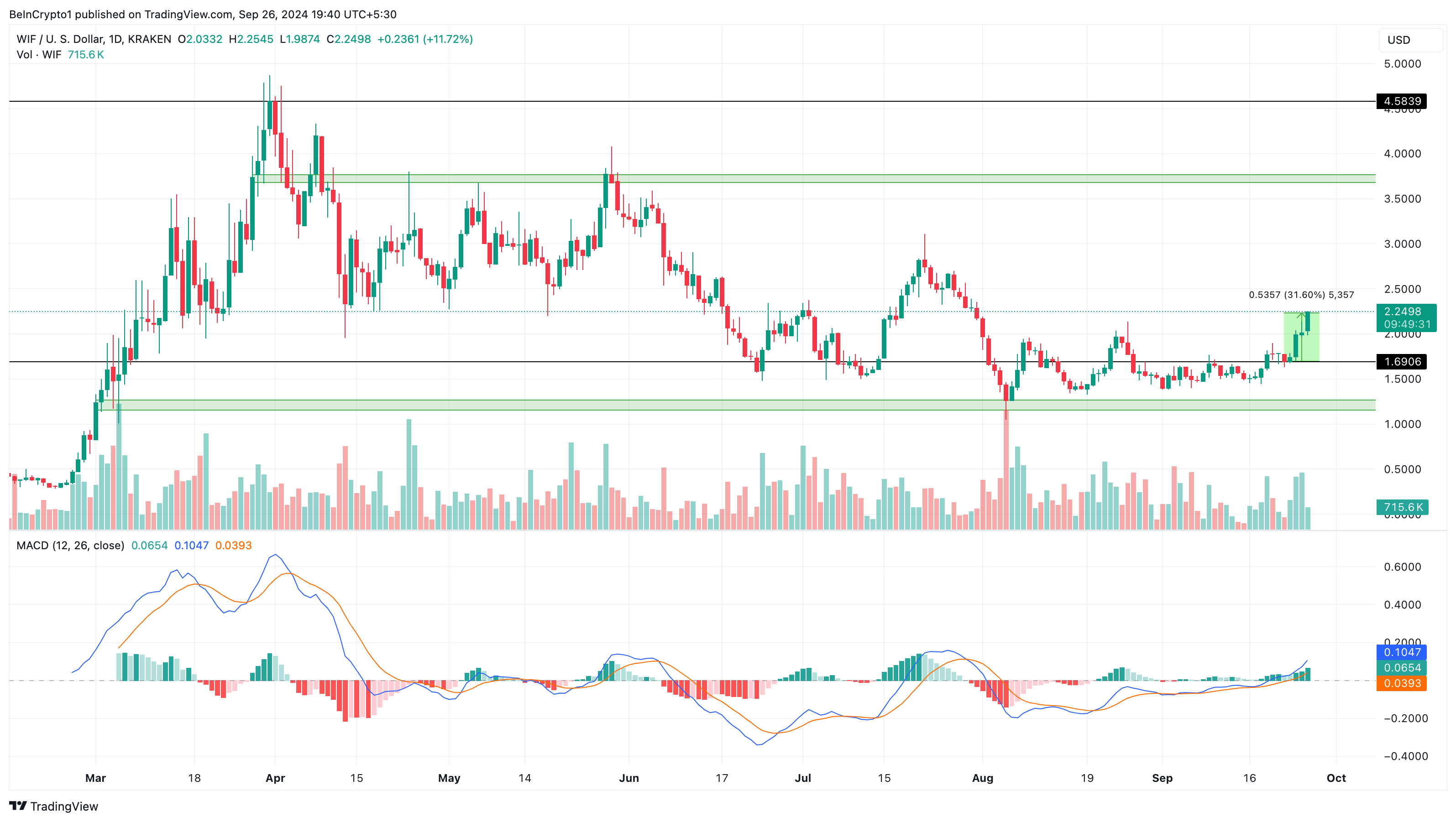 Teknisk analys av det dagliga diagrammet visar att WIF:s studs från 1,15 USD i augusti var en avgörande katalysator för dess senaste löpning till 2,25 USD. Dessutom är Moving Average Convergence Divergence (MACD) positiv.