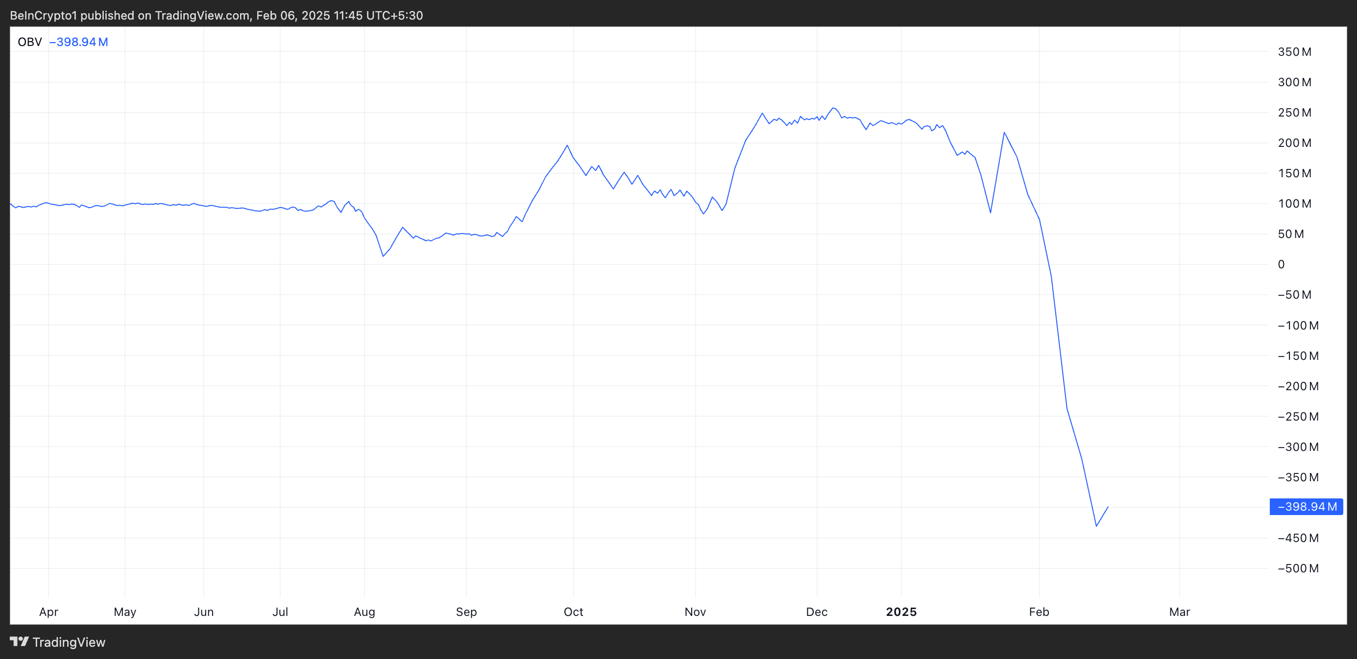 En fallande OBV som denna indikerar att säljtrycket överstiger köptrycket. Det betyder att fler handlare säljer tillgången än köper den.