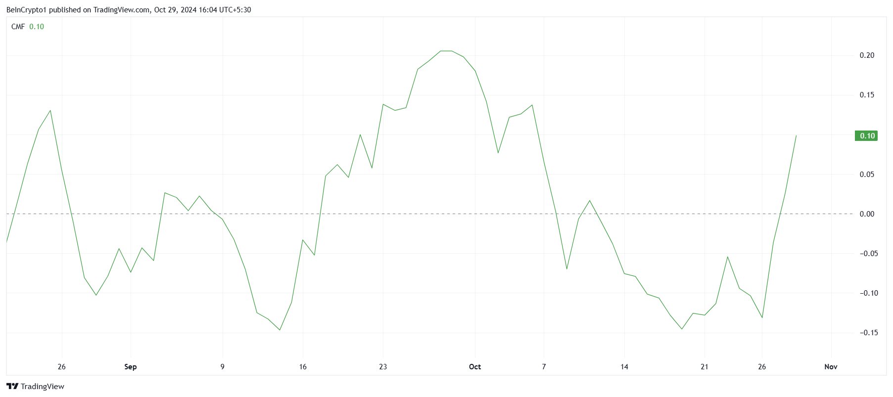 Indikatorn Chaikin Money Flow (CMF) för WIF har nyligen visat en kraftig uppgång, vilket indikerar en betydande ökning av inflöden. Detta markerar den första märkbara ökningen i CMF sedan månadens början, eftersom WIF huvudsakligen har upplevt utflöden. Återkomsten av inflöden är en positiv utveckling, som signalerar att köpare återvänder till marknaden med ett förnyat intresse för meme-myntet.