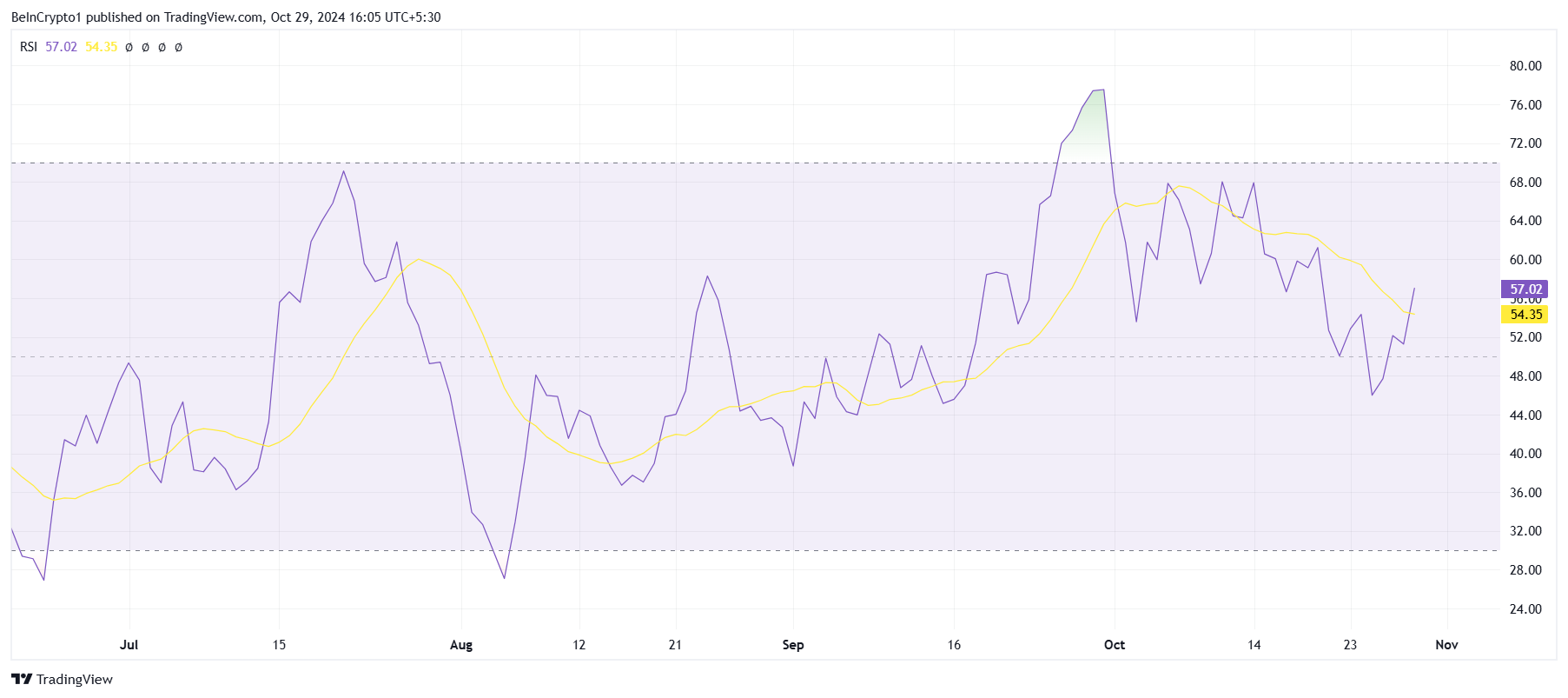 Förutom inflöden verkar WIF:s makromomentum vara gynnsamt, som ses i tekniska indikatorer som Relative Strength Index (RSI). RSI har återhämtat sig till den positiva zonen, stigit över den neutrala linjen vid 50,0, vilket signalerar att den optimistiska momentet stärks. Denna RSI-position är viktig, eftersom den bekräftar att köptrycket byggs upp och WIF:s nuvarande trend är stabil.