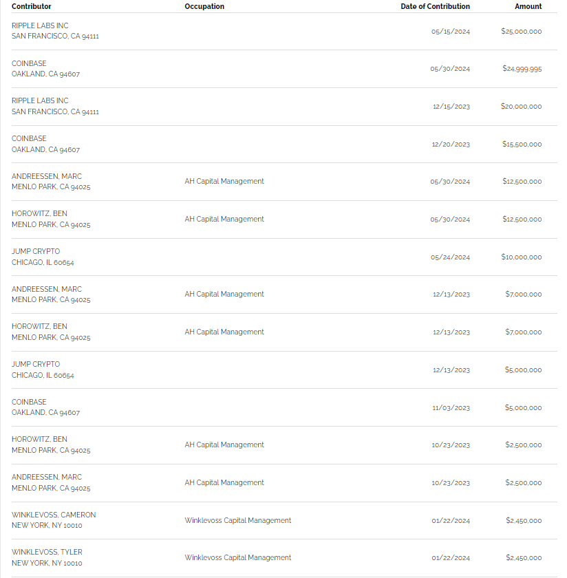 Både Winklevoss-tvillingarna och Ripple Labs har en historia av betydande donationer för att stödja politiska insatser som gynnar krypto. BeInCrypto rapporterade att för valcykeln 2023-2024 donerade tvillingarna och Ripple Labs mer än 45 miljoner dollar respektive 4,6 miljoner dollar till Fairshake, en kryptofokuserad Super Political Action Committee (PAC).