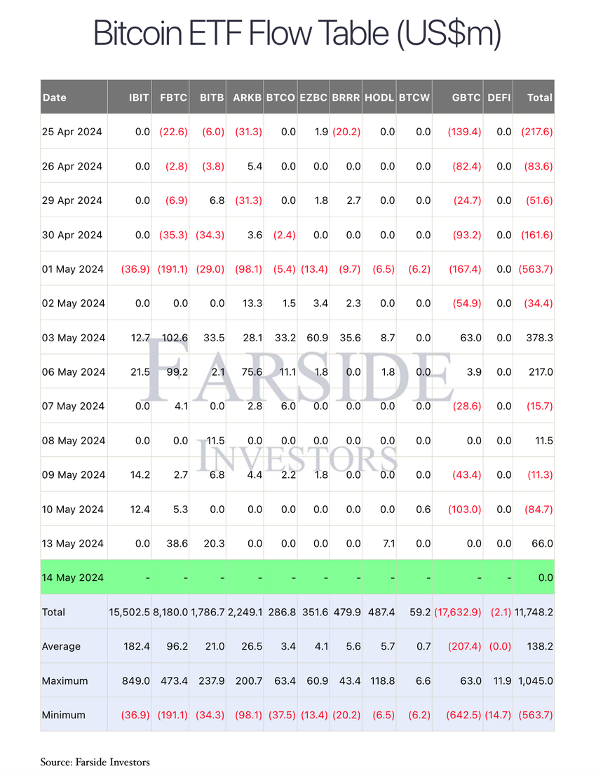 Investeringarna i dessa nya finansiella instrument visar inga tecken på att sakta ner. Under de senaste 24 timmarna registrerades nästan 66 miljoner dollar i nettoinflöden, vilket innebär att de totala inflödena uppgick till nästan 11,75 miljarder dollar. Bland de anmärkningsvärda vinnarna var FBTC, som fick 39 miljoner dollar i inflöden; BITB, som fick 20 miljoner dollar; och HODL, som fick 7 miljoner dollar.