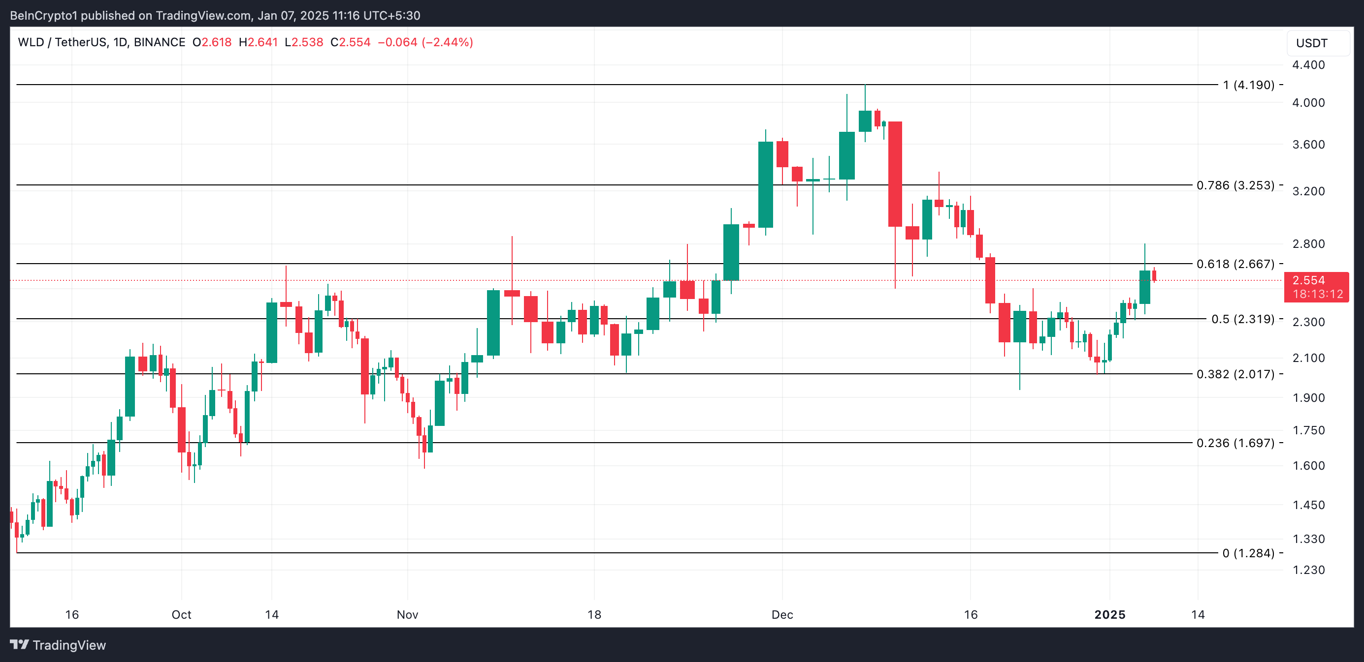 På det dagliga diagrammet, handlas WLD för närvarande under motståndet som bildats vid 2,67 USD. Om den nuvarande positiva trenden fortsätter, kan token bryta över denna barriär och stiga mot 3,25 USD.