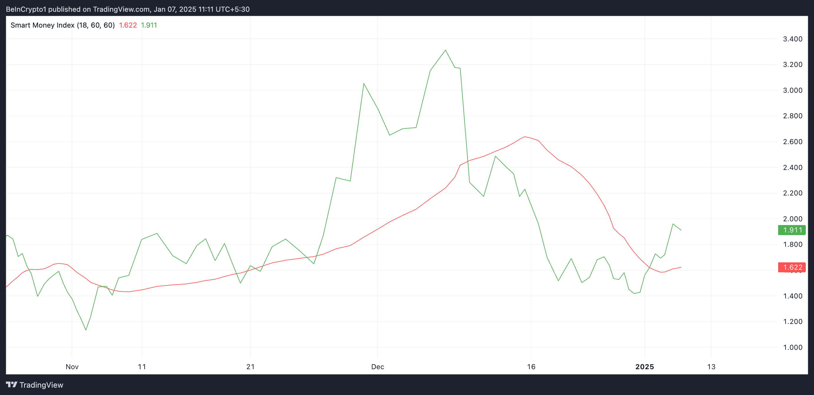 BeInCrypto’s bedömning av WLD/USD en-dags diagram har visat en stadig ökning i tokenens Smart Money Index (SMI) sedan årets början. Vid skrivande stund är indikatorn på 1,91, efter att ha stigit 36 % sedan 31 december.