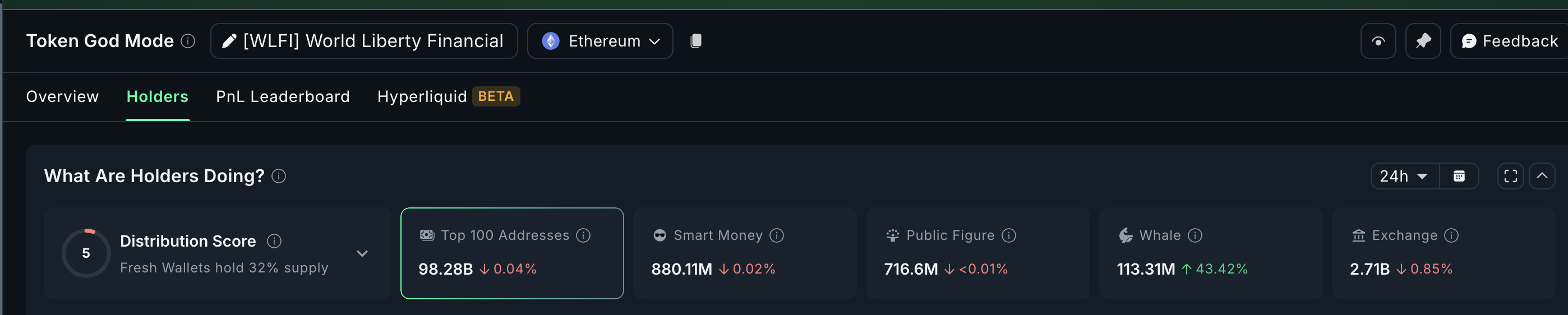 Även under WLFI:s kraftiga nedgång har stora investerare ökat sina innehav. Under de senaste 24 timmarna har deras saldon ökat med 43,42 %, från 79,01 miljoner WLFI till 113,31 miljoner WLFI.