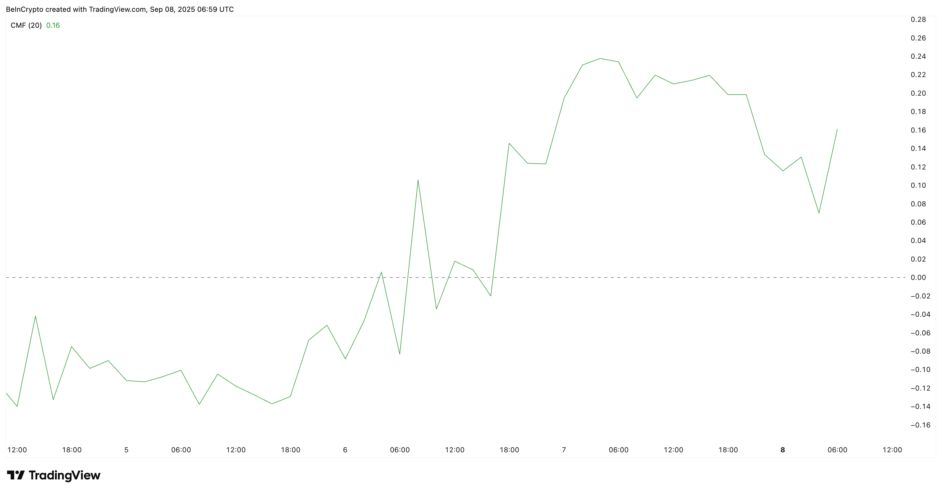 Köpen förklarar varför Chaikin Money Flow (CMF) — ett mått på om pengar flödar in eller ut ur en token — fortfarande är starkt positivt nära +0,17.