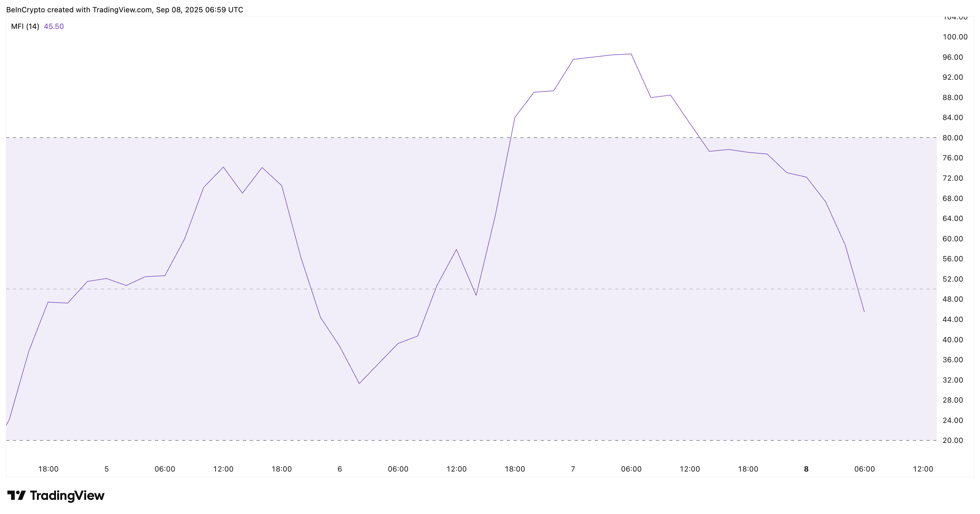 Samtidigt har Money Flow Index (MFI) — som jämför handelsvolym med pris för att visa om dippar köps eller säljs — sjunkit på 2-timmarsdiagrammet.