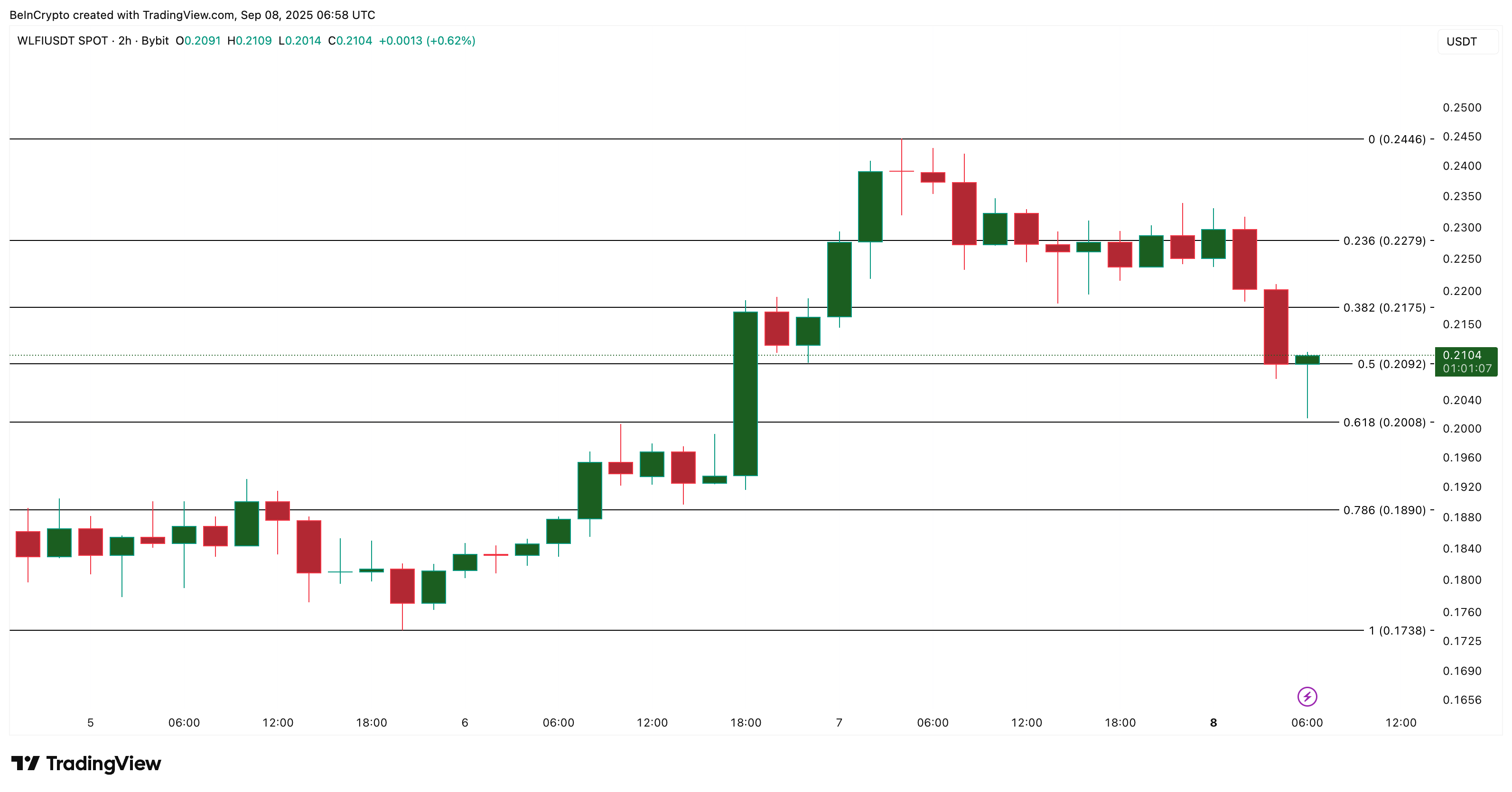 World Liberty Financial (WLFI) handlas nära 0,21 USD just nu, ner nästan 12 % de senaste 24 timmarna. Från sin topp på 0,33 USD den 1 september har WLFI-priset nu korrigerats med ungefär 37 %.