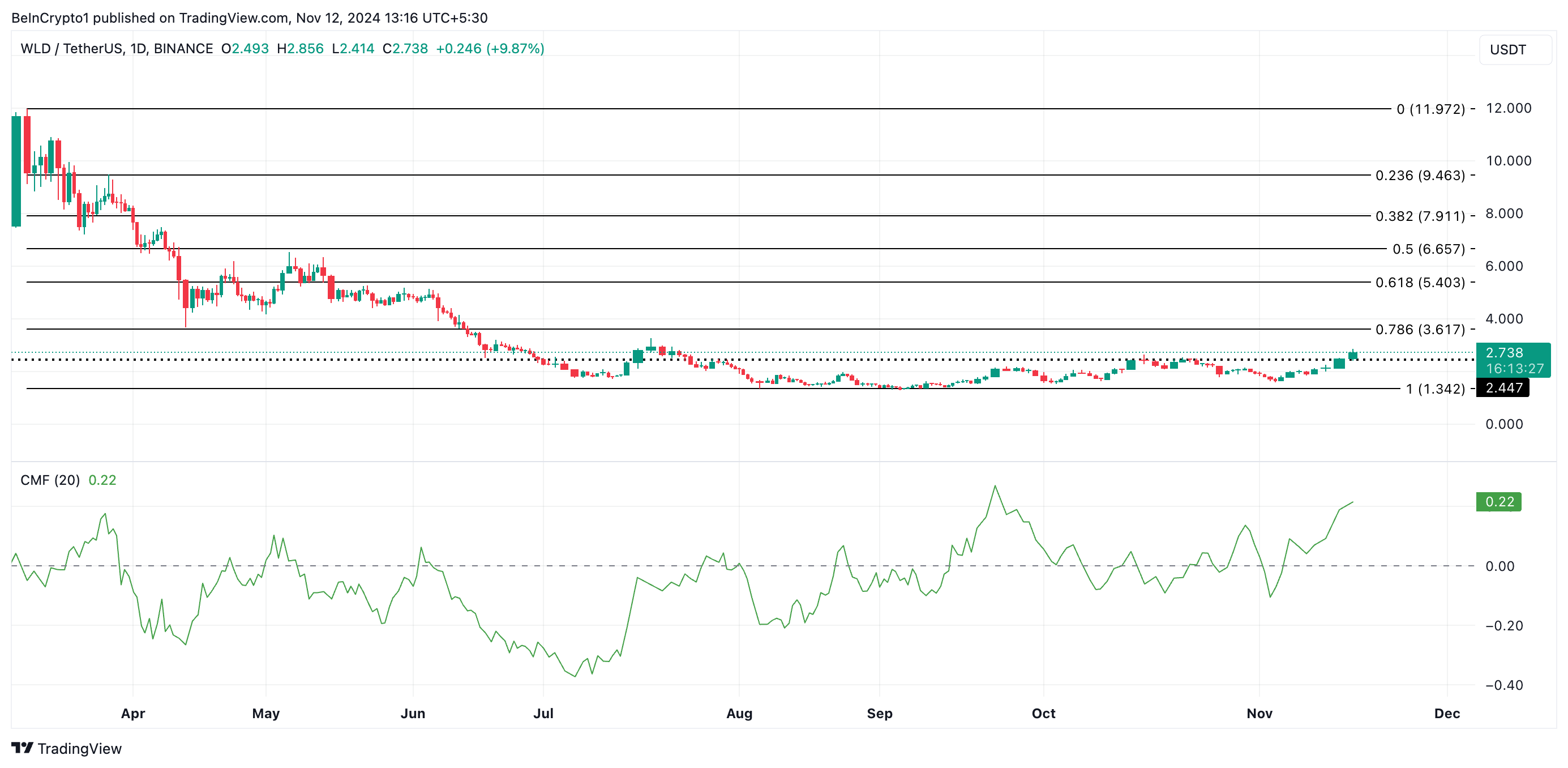 I skrivande stund handlas WLD till 2,73 USD, något över motståndsnivån på 2,44 USD. Dess stigande Chaikin Money Flow (CMF), för närvarande på 0,22, bekräftar hög efterfrågan på altcoinen. CMF mäter pengaflödet in och ut ur en tillgång. När det är över noll signalerar det marknadsstyrka och höga likviditetsinflöden.