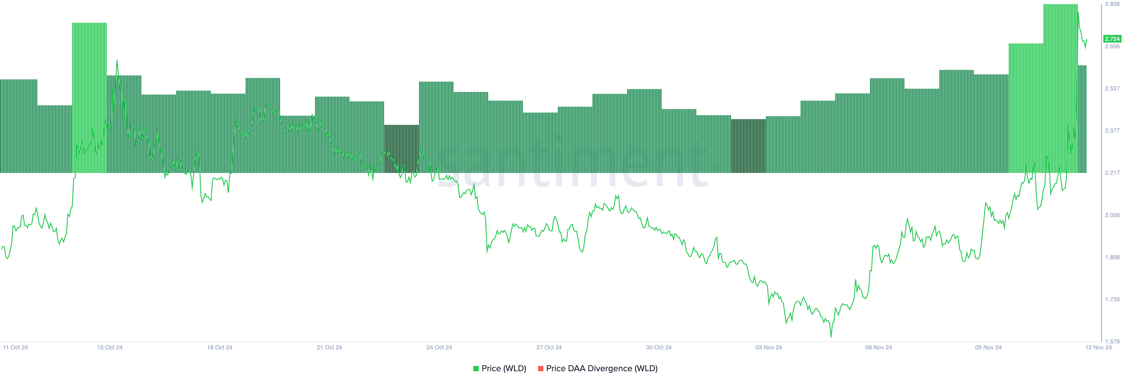Worldcoins värde har ökat med 27% under de senaste 24 timmarna. Den handlas för närvarande till 2,73 USD, en prisnivå som senast nåddes i juli. Altcoinens rally de senaste veckorna har stötts av ett betydande efterfrågan, som framgår av de positiva avläsningarna från dess dagliga aktiva adressers (DAA) divergensmått. Vid pressens tidpunkt är detta måtts värde på 137,92%.