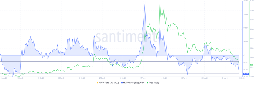 Att kombinera det med förhållandet mellan marknadsvärde och realiserat värde (MVRV) ger en optimistisk utsikt. MVRV-kvoten bedömer investerarnas vinst och förlust. För närvarande ligger Wordlcoins 30-dagars MVRV på -35%, vilket indikerar förluster, vilket kan leda till köptryck.