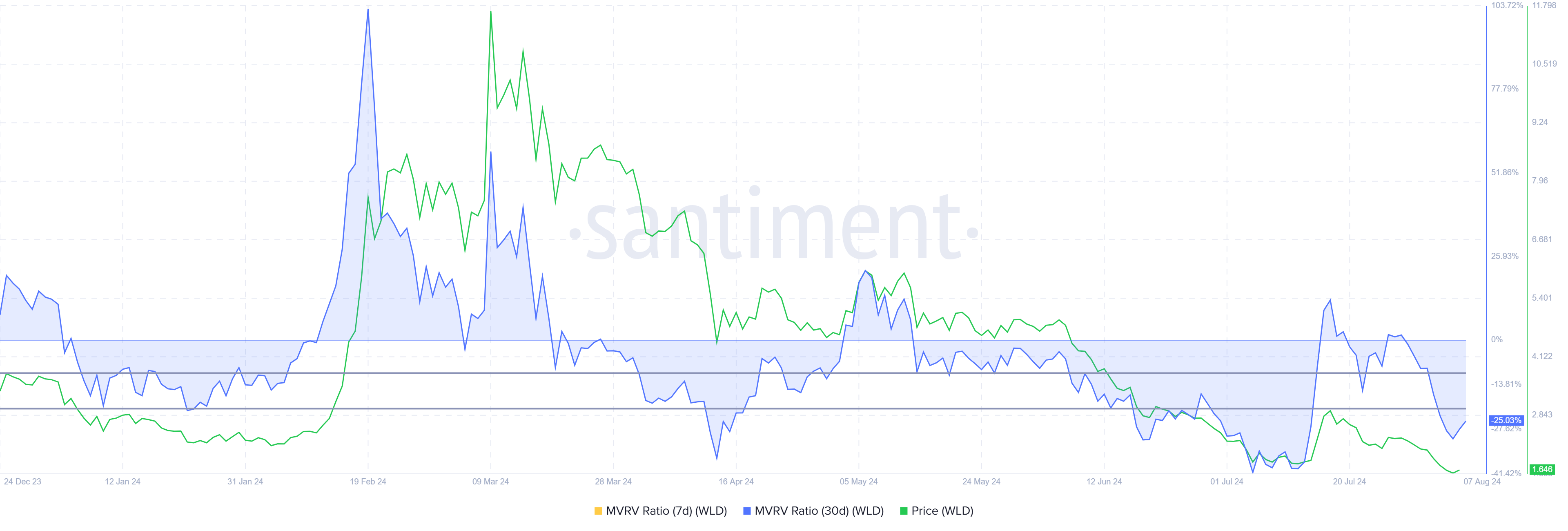 Detta kan också leda till att vissa investerare drar nytta av de låga priserna och lägger till WLD till sina innehav. Förhållandet mellan marknadsvärde och realiserat värde (MVRV) bekräftar denna möjlighet.