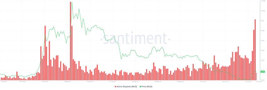 Naturligtvis, för att förhindra att förlora dessa vinster, flyttade WLD-innehavare för att sälja. Detta är synligt i den massiva ökningen av aktiva insättningar, vilket är ett mått som används för att mäta flödet av tokens från investerares plånböcker till börsernas plånböcker.