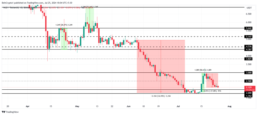 Worldcoins pris på 2,12 dollar har sjunkit med mer än 27% under de senaste åtta dagarna efter att ha misslyckats med att bryta 3,0 dollar. Att bryta igenom detta motstånd skulle ha utlöst en återhämtning för WLD.