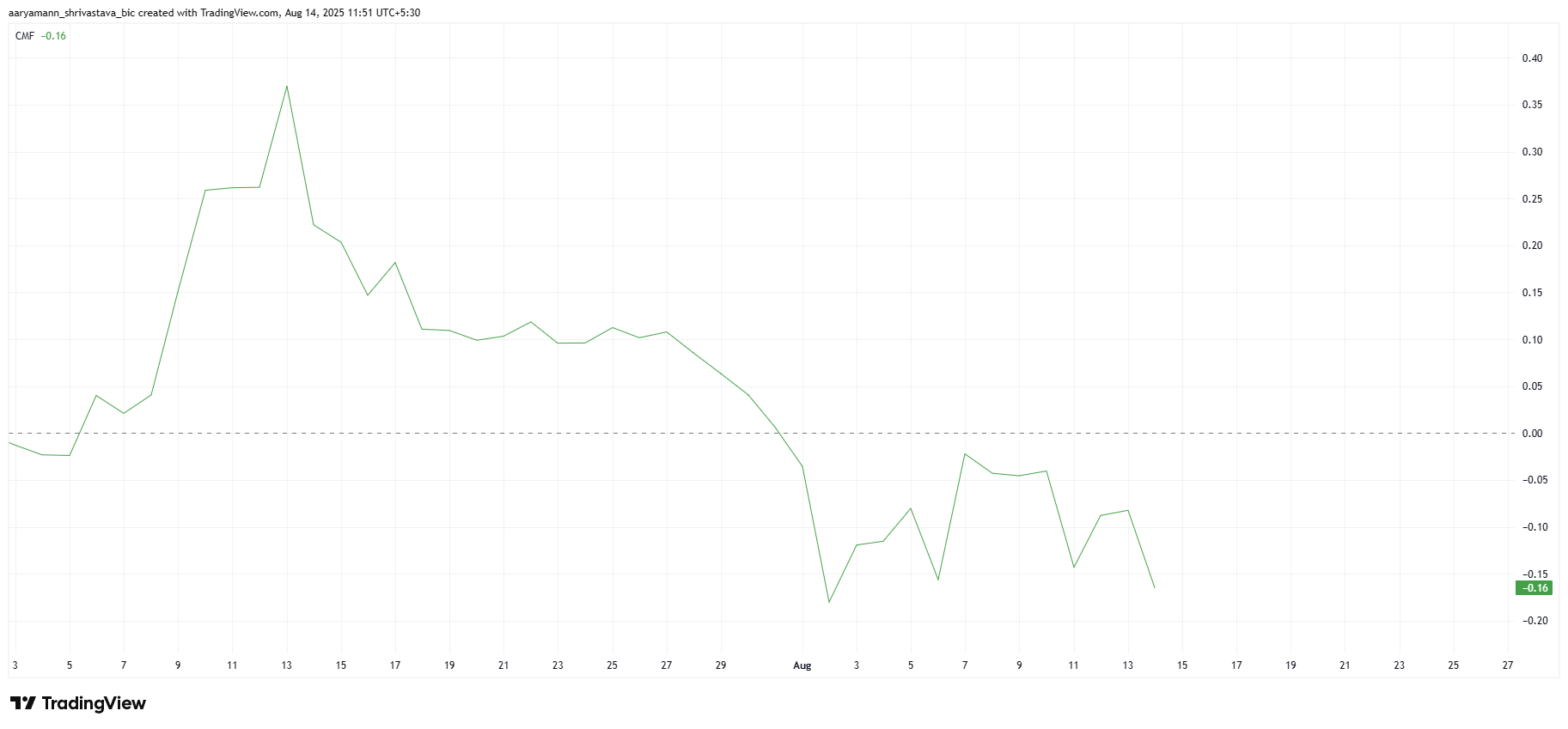 Chaikin Money Flow (CMF) för XLM har sjunkit under nollstrecket, vilket indikerar en ökning av utflöden. Denna förändring är ett tecken på att investerare kanske säljer sina innehav, möjligen som ett resultat av den senaste prisuppgången.