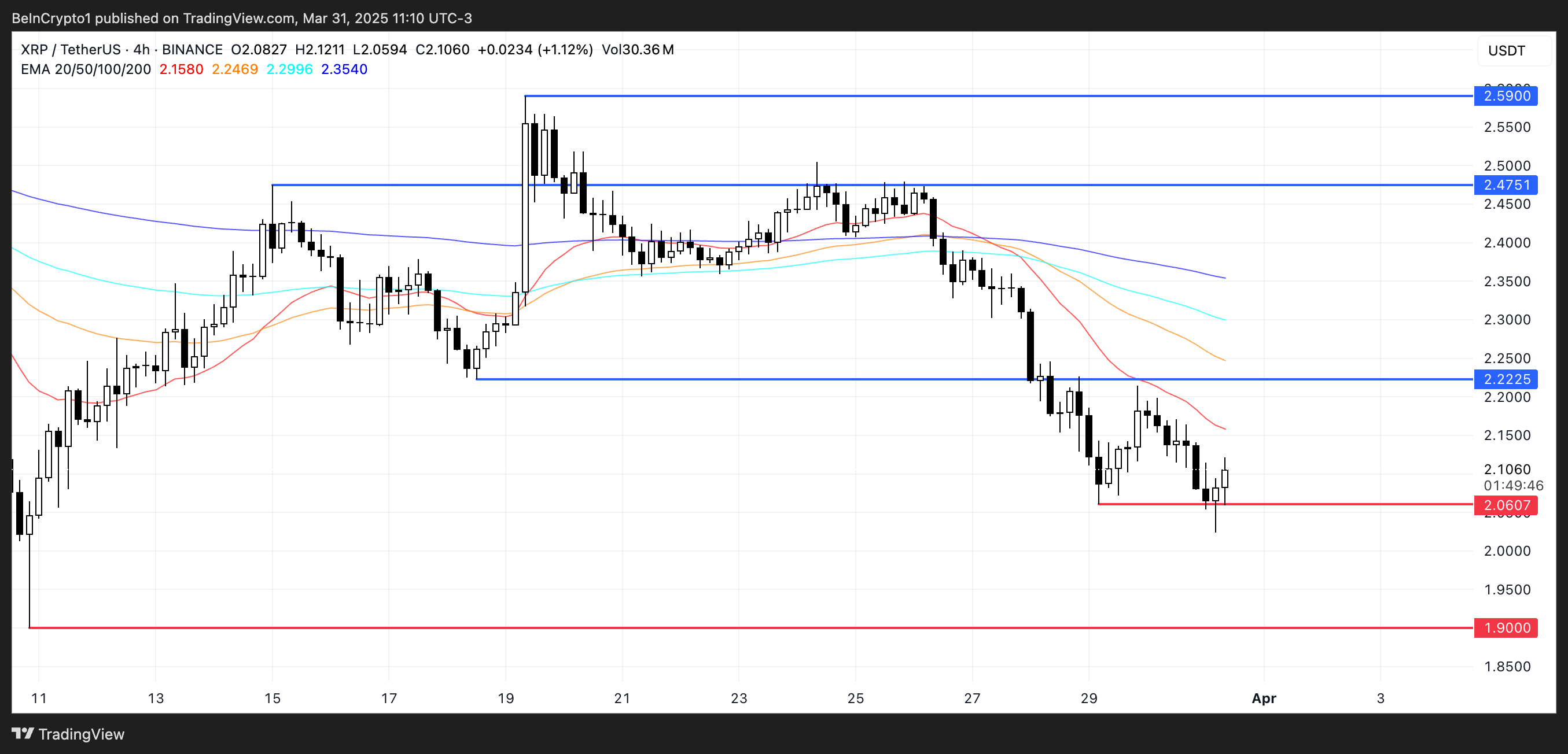 Om trenden börjar skifta och XRP bryter över de kortsiktiga EMA:erna, är det första viktiga motståndet att bevaka vid 2,22 USD. En lyckad rörelse över denna nivå kan utlösa en starkare återhämtning, vilket potentiellt kan driva priset mot 2,47 USD.