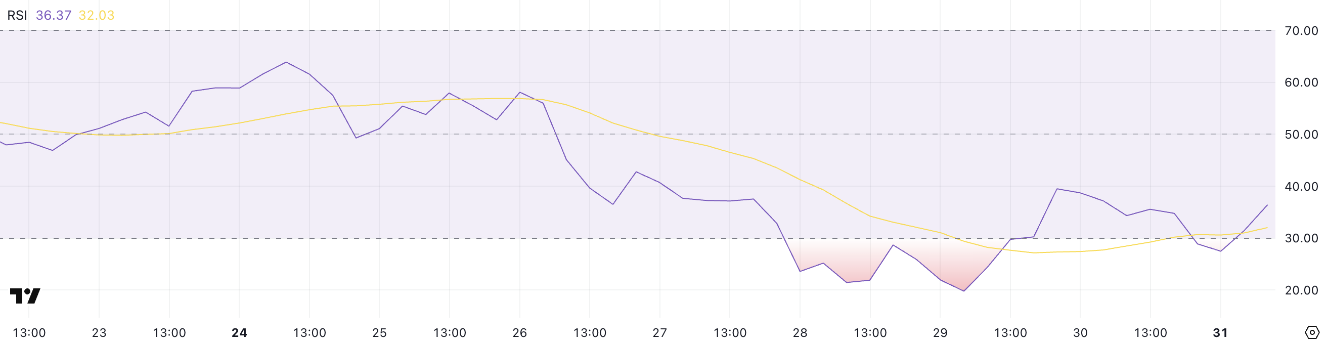 XRP:s återhämtning från 27,49 till 36,37 signalerar att den kan ha lämnat översålda förhållanden. Detta kan betyda att den senaste säljfasen avtar. Om köptrycket fortsätter att öka, kan XRP gå in i de tidiga stadierna av en potentiell återhämtning.