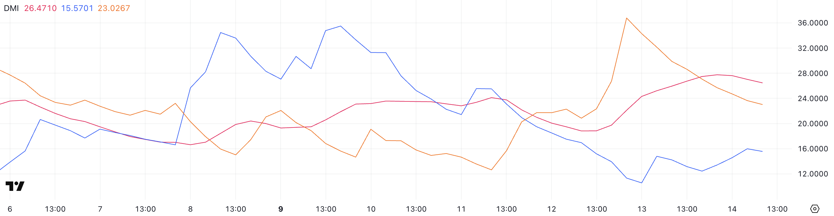 XRP:s Average Directional Index (ADX)—som mäter styrkan i en trend oavsett riktning—har stigit till 26,47, upp från 18,84, och passerar den viktiga 25-gränsen som vanligtvis markerar början på en stark trend.